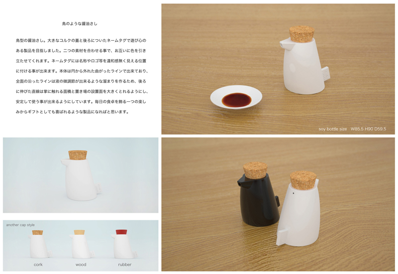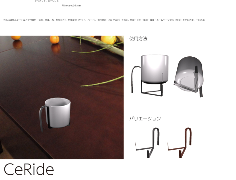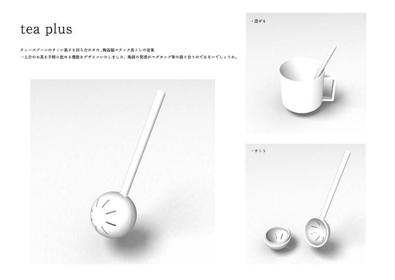 野村 悠/東京都杉並区 素材:陶器 ○ティースプーンのすくい易さを持ち合わせた、ステック茶こしの提案。1人分のお茶を気軽に飲める機能をデザインいたしました、陶器の質感がマグカップなどの器に合うのではないでしょうか。 |