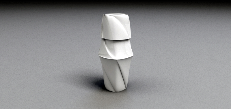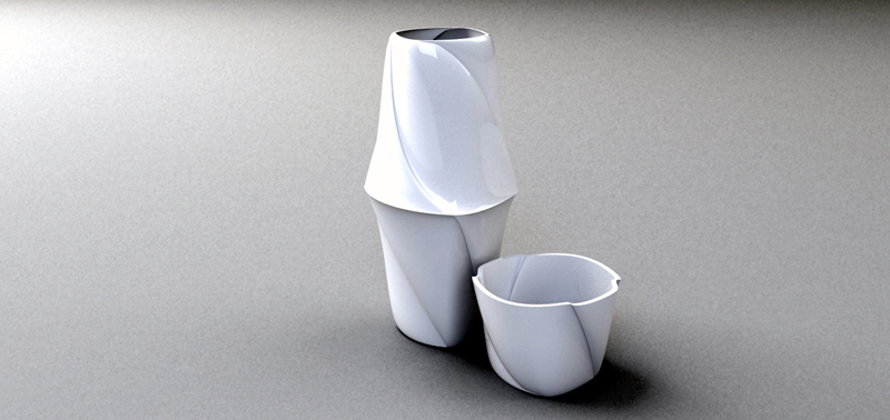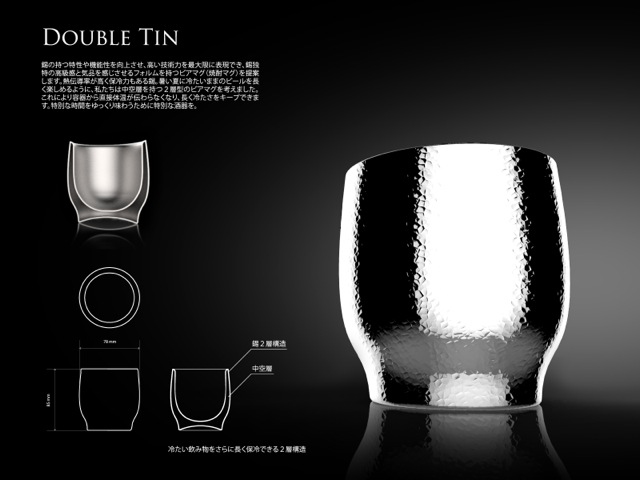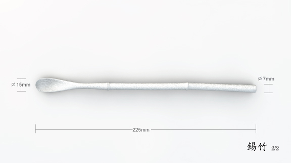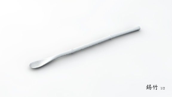 遠藤陽彦/埼玉県所沢市 使用素材: 錫 ○竹は水、酒等に対しミネラルの補給、カルキの吸着、消臭などがある素材で、錫に近い特性を持っている。竹のフォルムにする事により、錫が竹に近い特性があるというデザインコミュニケーションを試み、金属と天然素材との間の新たな可能性を示した。 |