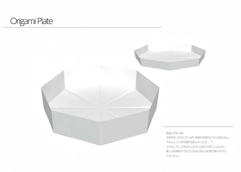 松田成美/大阪府大阪市 使用素材:磁器 ○昔遊んだ折り紙。お皿を折ったのにやっぱり本物のお皿のようには使えない。でももしこれが本物のお皿になったら…? 小さな頃にできなかったそんな思いを形にしました。真っ白の陶器でできているのでいろいろな料理で飾り付けてもらいたい。 |