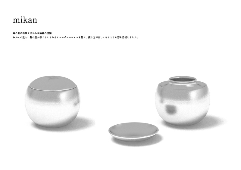 野村 悠/東京都杉並区 素材:錫 ○錫の肌の特徴を活かした酒器の提案。みかんの肌と、錫の肌が似てることからインスピレーションを得て、使う人が楽しくなるような形を目指しました。 |