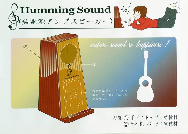 長谷川幹人/神奈川県横浜市 素材:木材 ○電源のない室内や屋外などで、携帯音楽プレーヤーの音楽などを皆で共有したい時、クラシックギターと同じ仕組みで音の共鳴を利用した電力を使用しない無電源アンプスピーカーです。音楽プレーヤーのスピーカー面をボディトップに当てて使用します。題してHumming Soundを提案します。 |