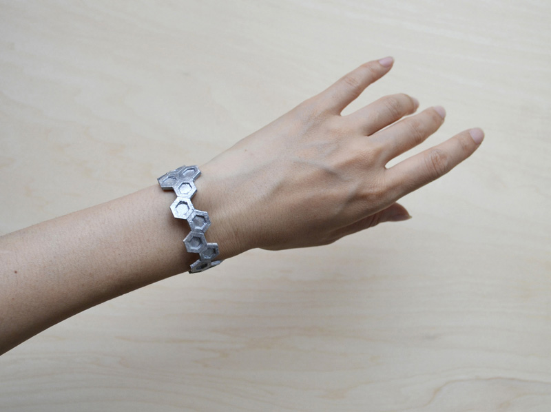 馬渕晃/東京都西東京市 制作環境:Photoshop CS2、Windows 7 ○Braceletinはbracelet(ブレスレット)とtin(錫)からなる造語で錫製のブレスレットを意味します。タコ(多幸)や亀(長寿)をかたどったその板は錫の特性をいかし手首などに合わせ曲げることができます。さりげなくおめでたい気持を錫という素材を用いて、やさしく身につけられたらいいと思います。 |