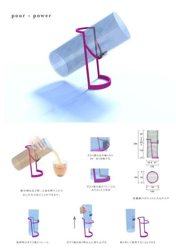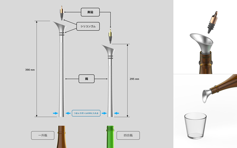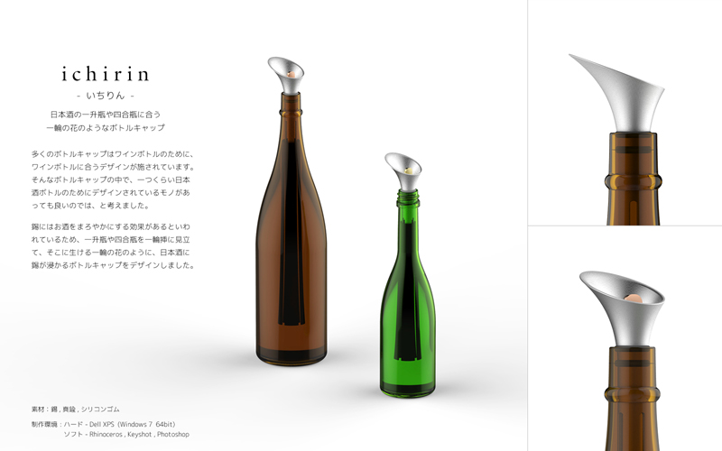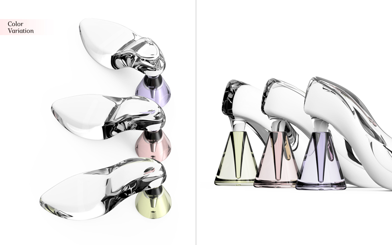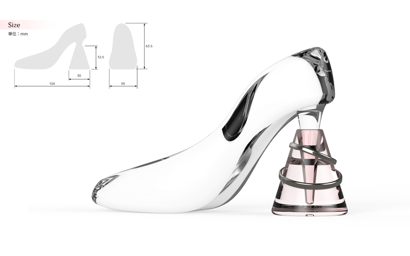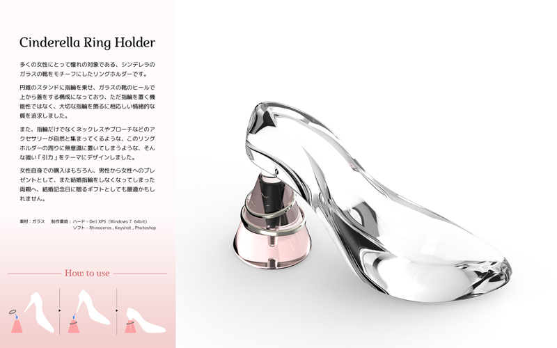 奈須田友也/福岡県直方市 制作環境:Rhinoceros、KeyShot、Photoshop、Windows 7 ○多くの女性にとって憧れの対象である、シンデレラのガラスの靴をモチーフにしたリングホルダーです。円錐のスタンドに指輪を乗せ、ガラスの靴のヒールで上からふたをする構成になっており、ただ指輪を置く機能性ではなく、大切な指輪を飾るに相応しい情緒的な質を追求しました。 |