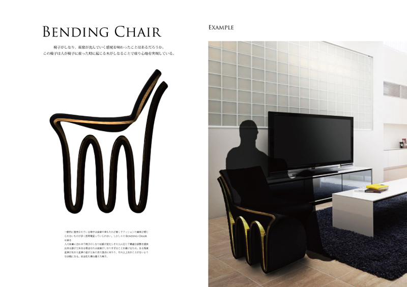 赤藤晃大/大阪府大阪市 制作環境:Rhinoceros 4.0、Photoshop ○座席がしなり、身体が沈んでいく感覚を味わったことはあるだろうか。この椅子は人が座った時に木がしなり、座り心地を実現している。 |