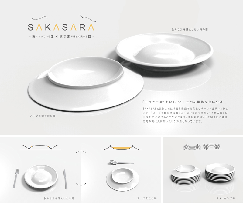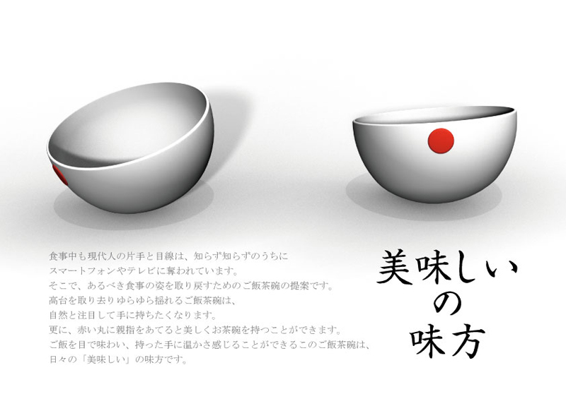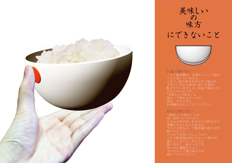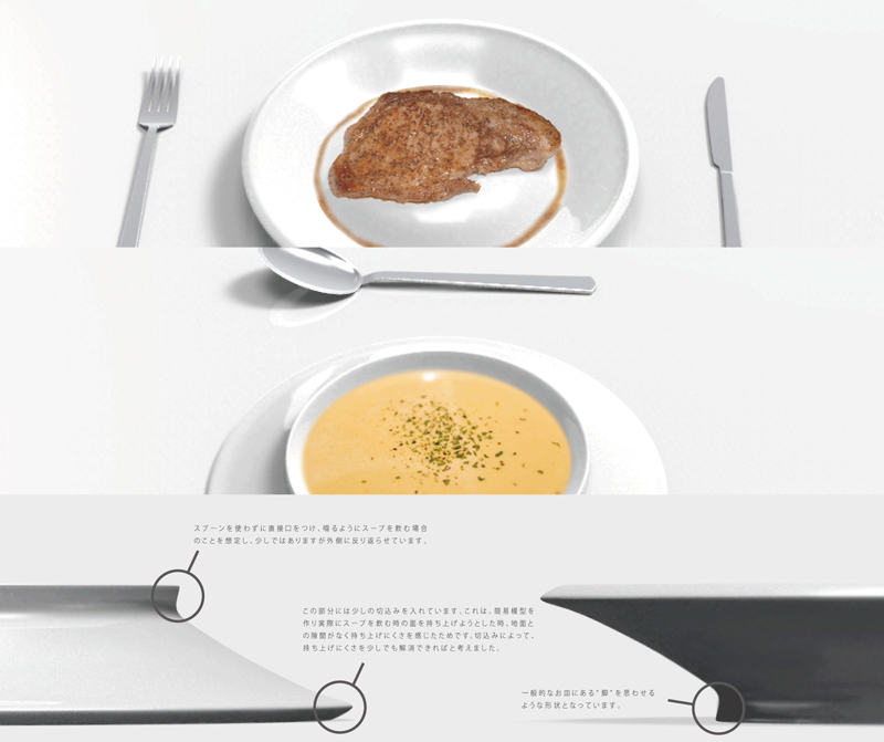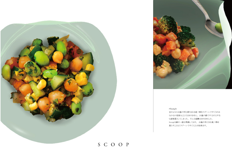 赤藤晃大/大阪府大阪市 制作環境:Rhinoceros 4.0、Photoshop ○細かく刻まれた食べ物を1つ残らず食べることはなかなか困難です。市販の皿ではいくらスプーンやフォークですくう努力をしても皿の中を具材が滑りまわり結局皿からこぼれ落ちてしまいます。scoopは皿の一部が湾曲しています。その湾曲を利用することで、具材が自然とスプーンやフォークの中に転がり込んでいきます。