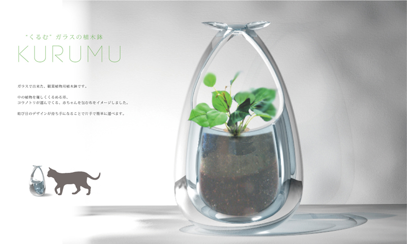 溝渕功一郎/京都市左京区 素材:ガラス ○ガラスで出来た、観葉植物用の植木鉢です。中の植物を優しくくるめる形、コウノトリが運んでくる赤ちゃんを包む布をイメージしました。結び目のデザインが持ち手になることで片手で簡単に運べます。 |