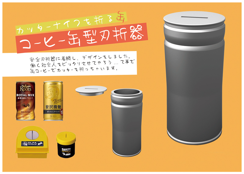 畑 了斗/大阪府堺市 制作環境:Rhinoceros ○安全刃折器に着眼し、デザインしました。働く社会人をビックリさせてやろう…てことで、缶コーヒーでカッターを折っちゃいます。 |