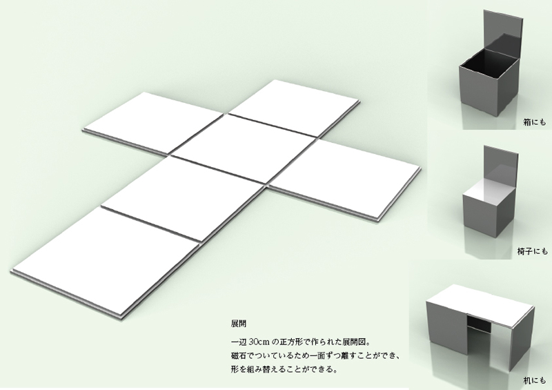 胡 遥香/大阪市阿倍野区 制作環境:Rhinoceros、Illustrator ○コンセプトは展開図。平たい板かと思えば箱になり、箱かと思えば椅子にも机にもなる。そんな変化のあるものをつくりたいと考えた。 |