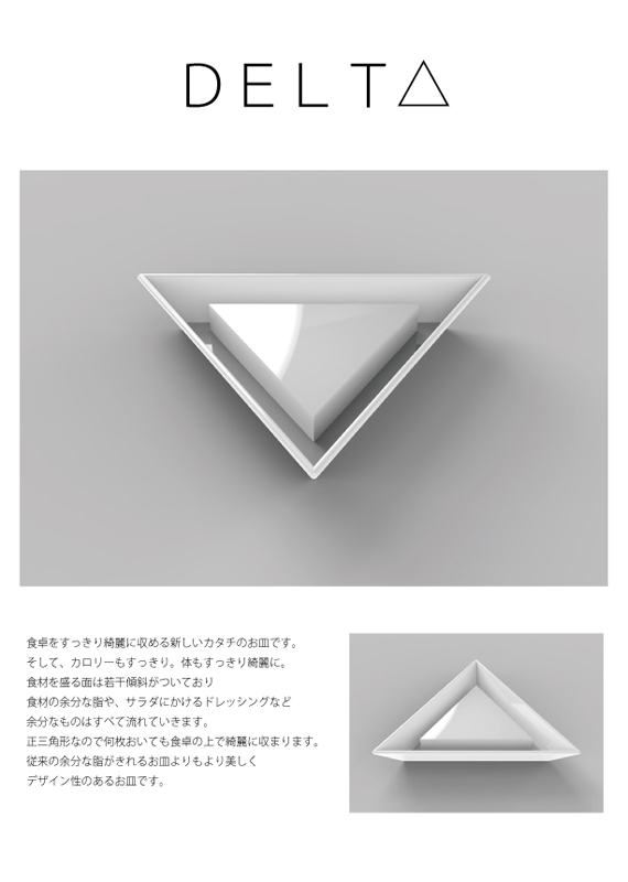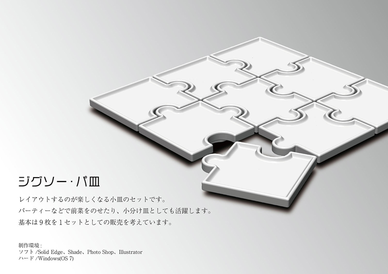 大越拓磨/兵庫県神戸市 制作環境:Solid Edge、Shade、PhotoShop、Illustrator、Windows 7 ○レイアウトするのが楽しくなる小皿のセットです。パーティーなどで前菜をのせたり、小分け皿としても活躍します。基本は9枚を1セットとしての販売を考えています。 |