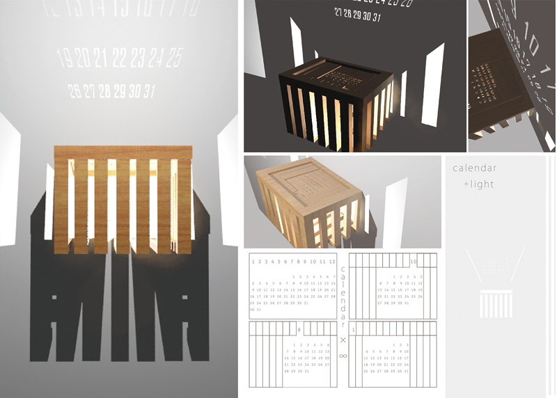 岡田望愛/大阪府松原市 制作環境:Rhinoceros 4.0、3ds Max ○壁掛け電灯で、光が壁に映ったところがカレンダーになっている。カレンダーはパーツを動かすことによっていつ、どの年のどの月でも対応できるようになっている。カレンダーを置かなくなったこの時代に、家具としてのカレンダーをライトで演出。 |