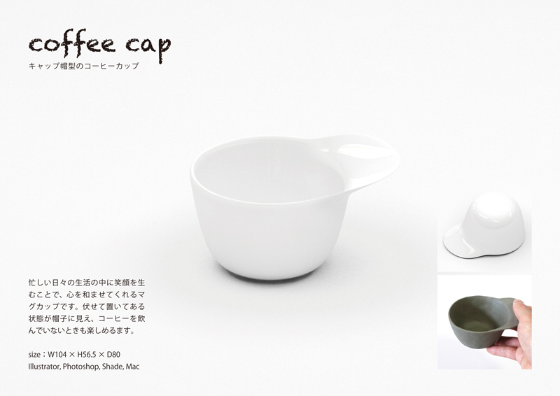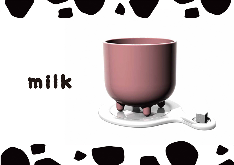 新美優季/大阪府大阪市 制作環境:Rhinoceros、Windows ○コップは牛の乳、下のコースターはこぼれている牛乳を表現しています。パッと見ただけでは牛と牛乳とは分からない面白さを求めました。普段の生活にちょっとしたユーモアを。 |