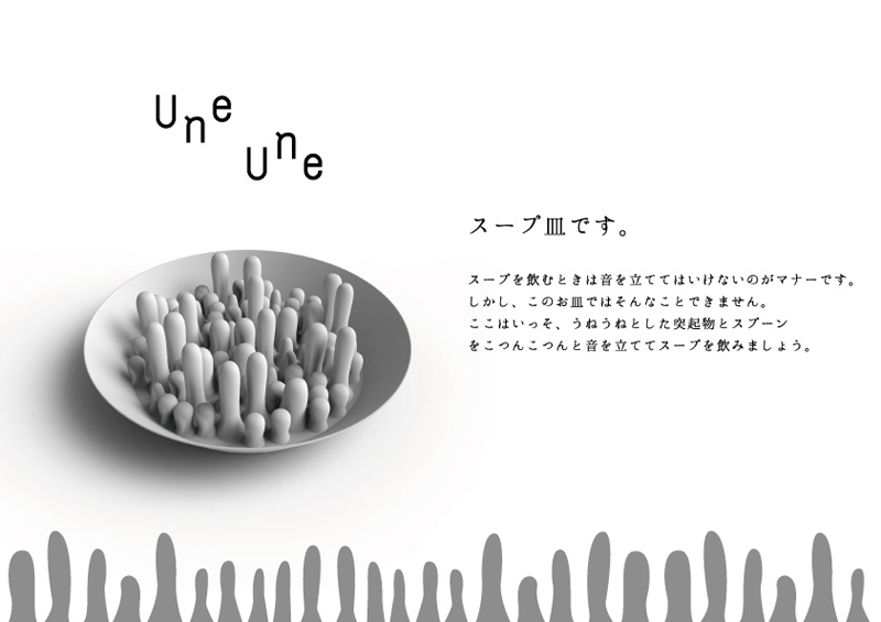 藤堂彩花/大阪府大阪市 素材:セラミック ○お皿はフラットな表面をしているのが当たり前です。なのであえてうねうねとした突起物を生やしました。スープをよそえるかどうか分かりませんが、新しいスープ皿でありたいです。 |