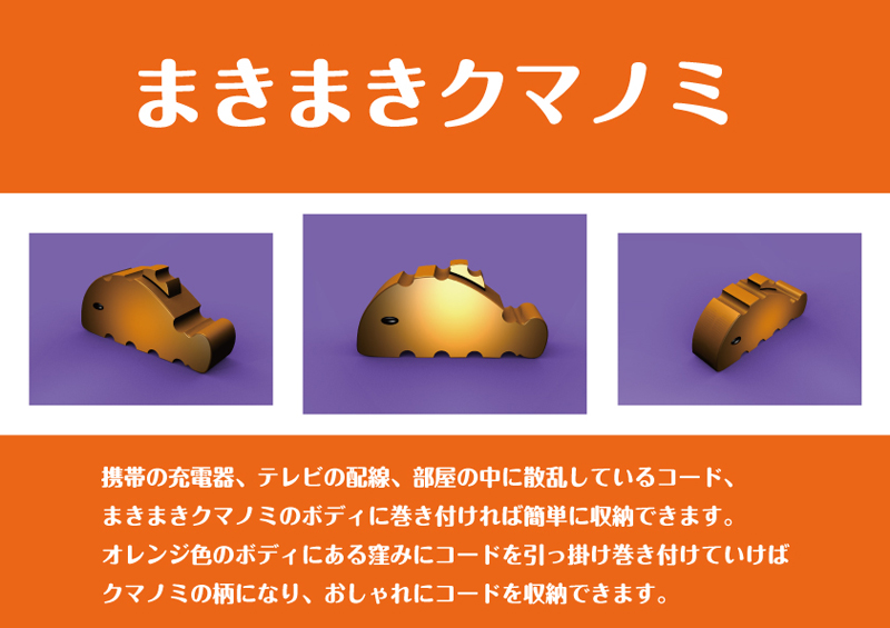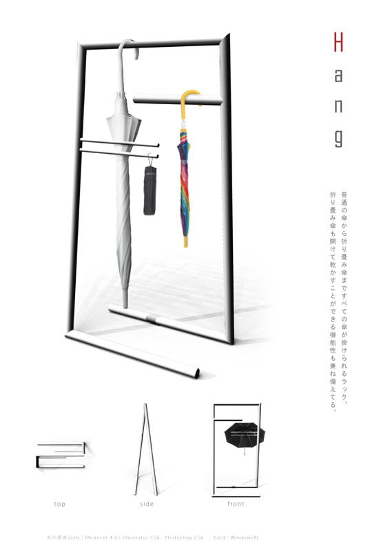 株本唯衣/大阪府大阪市 制作環境:Rhinoceros 4.0、Illustrator CS6、Photoshop CS6、Windows8 ○普通の傘から折り畳み傘まですべての傘が掛けられるラック。 |