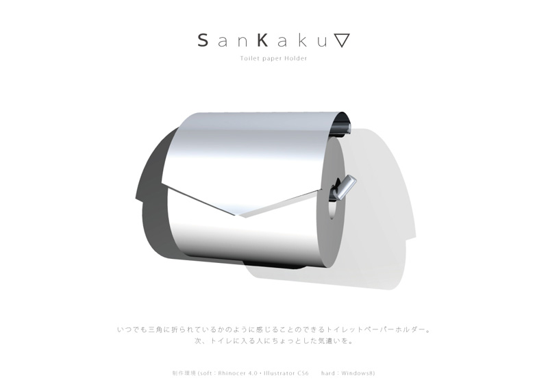 株本唯衣/大阪府大阪市 制作環境:Rhinoceros 4.0、Illustrator CS6、Windows8 ○いつでも三角に折られているかのように感じることのできるトイレットペーパーホルダー。次、トイレに入る人にちょっとした気遣いを。 |