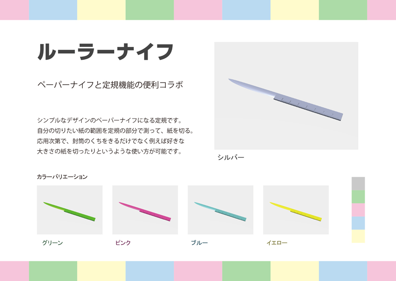 橋場麻央/大阪府大阪市 制作環境:Rhinoceros 4.0 ○シンプルなデザインのペーパーナイフになる定規というもので、より生活を便利にしたいということで制作しました。 |