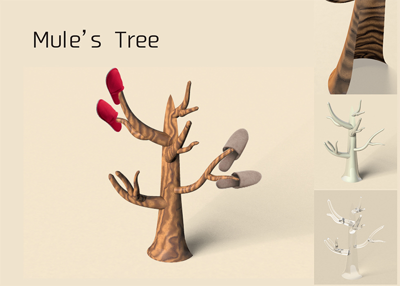 森脇美織/兵庫県西脇市 ○家で自然を感じることができるスリッパ立て。スリッパを木の実に見立て、実を収穫するようにスリッパを摘み取る感覚で履くことができる。木は半月型になっており、裏面は空洞なので、場所を取らずに壁に沿わす形での設置が可能。スリッパだけでなく、服や鞄などをかけることもできる。素材は木の他にガラスや陶で展開する。 |