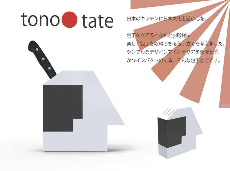 水掫 奏/大阪府東大阪市 ○日本のキッチンに日本文化と遊び心を。包丁を立てるとなんとお殿様に! 楽しく包丁を収納できる包丁立てを考えました。シンプルなデザインでインテリアを邪魔せず、かつインパクトのある、そんな包丁立てです。 |