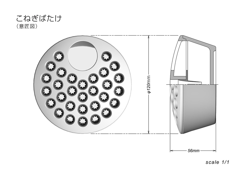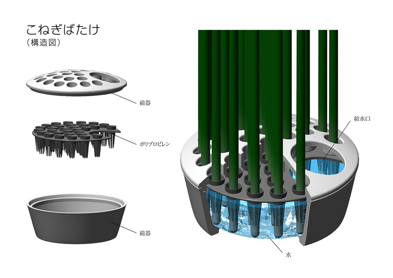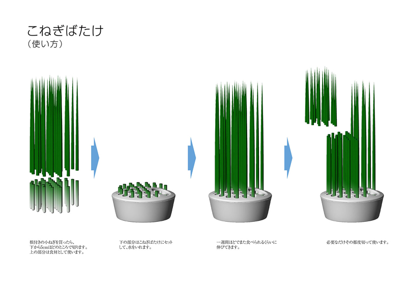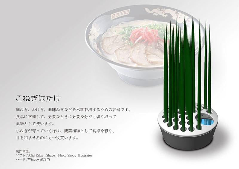 大越拓磨/兵庫県神戸市 制作環境:Solid Edge、Shade、PhotoShop、Illustrator、Windows 7 ○細ねぎ、わけぎ、薬味ねぎなどを水耕栽培するための容器です。食卓に常備して、必要なときに必要な分だけ切り取って薬味として使います。小ねぎが育っていく様は、観葉植物として食卓を彩り、目を和ませるのにも一役買います。 |