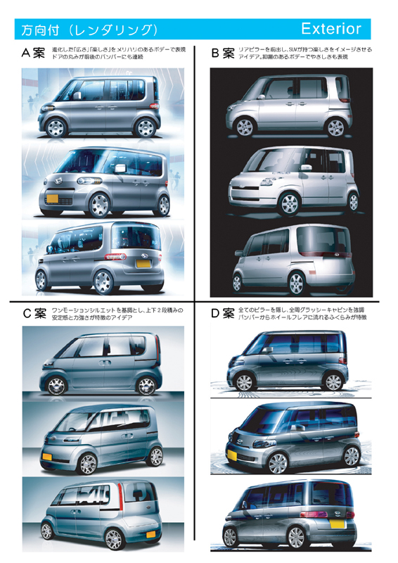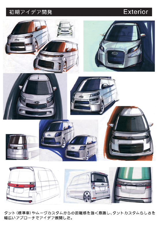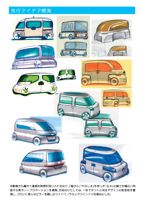 2007年12月デビューの2代目TANTOの先行アイデア開発。この段階では「遊び心」などのテーマを自由な発想をスケッチしていく(クリックで拡大)