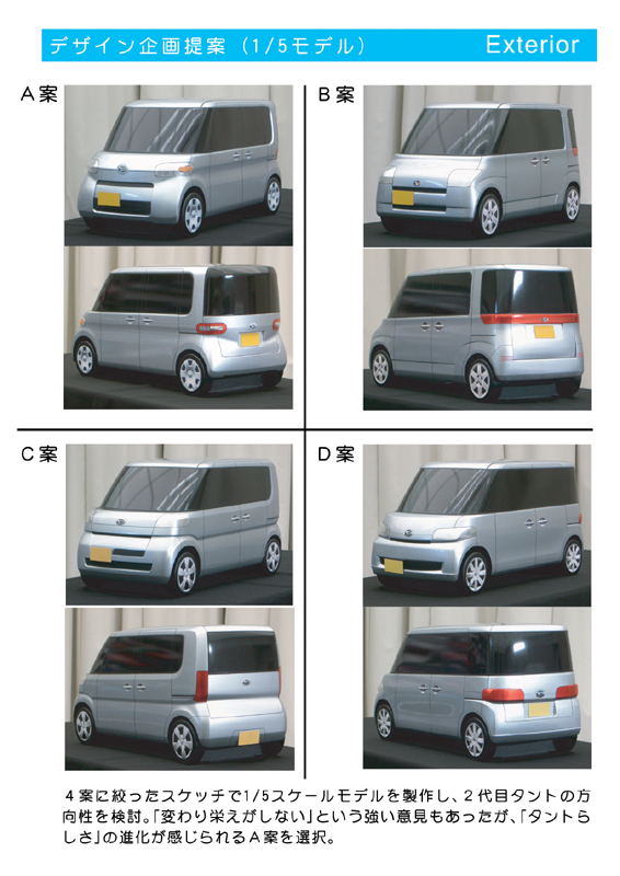 レンダリングでアイデアの方向性を2〜4案に絞ります。そして、それらのフルスケールモデルを製作し、その中から1案に絞り込みます。2代目TANTOは短期開発となり、異例ですが1/5モデルで1案に絞り込みを行い、フルスケールモデルで練りこみを重ねました。