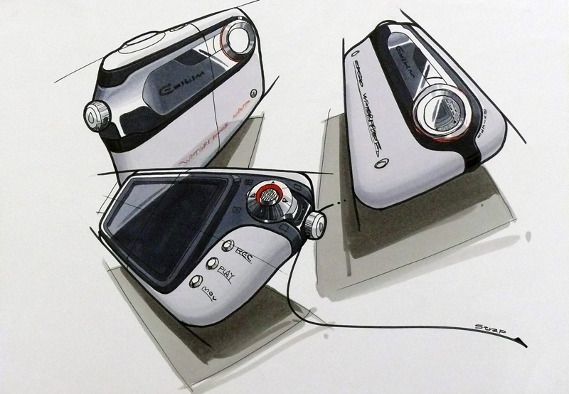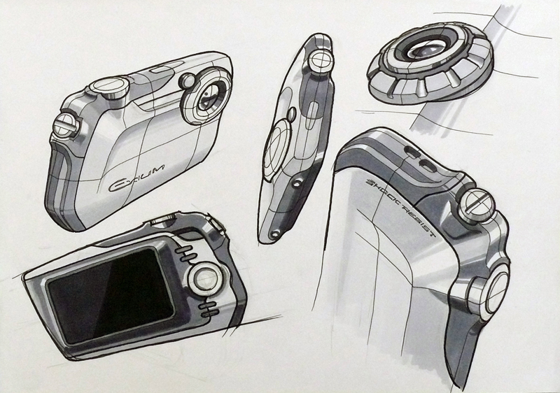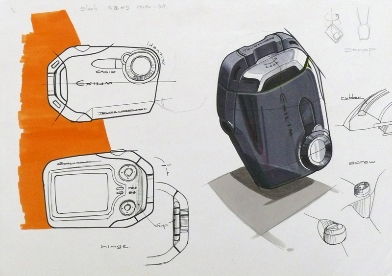 橋本:僕の場合は手描きスケッチです。ものによってはパソコン上でさらっとやってしまうこともありますが、今回の「EXILIM G」の場合は手描きの良さを生かしています。パソコンではささっと描けてしまいますがどうしても作りやすい造形になりがちですし、やはり手描きでしか出ない形があるので、今回は特にフリーハンドのスケッチにこだわりました。