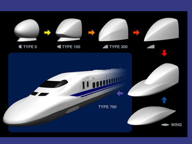 新幹線は0系からはじまり、100系、300系とスピードが上がってくるにつれ、高速化に対応するために先端がどんどん尖ってきました。その300系の形の下に走行安定性を持たせるためのウイングの形状を置くと…。