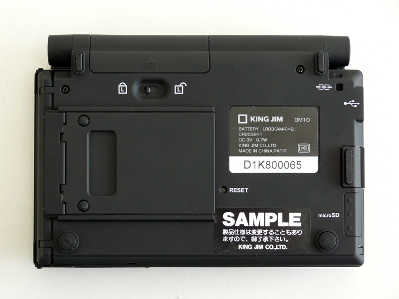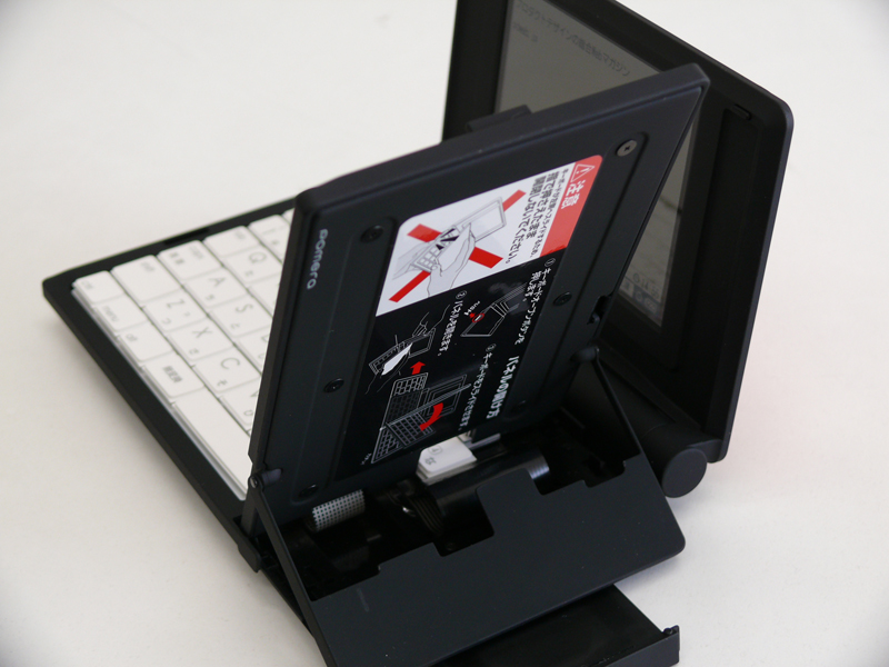 ポメラの裏面。右側にUSBのコネクタ、microSDのスロットが見える。左半分を占めるのは開いた状態のキーボードを支えるスライド式の脚部分(クリックで拡大) |
