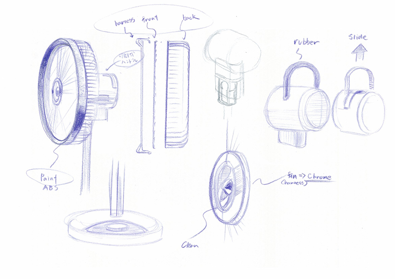 内田:最初はアイデアを手描きすることが多いですね。今回は扇風機ということで、造型的には3Dソフトでどんどん作っていきました。モックアップはそう何台も作れませんので、ある程度方向性が変わらない限りは、3D上で修正したものでプレゼンをしていく感じでしたね。