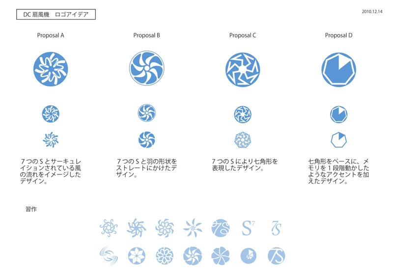 内田:また、今回は7という数字を商品アピールのキーポイントにしました。7枚羽根もそうなのですが、カタログなども7つのコンセプトを前面に出したデザインを採用することなどを、デザイン側から提案して展開させています。ネーミングも、当初は別の名前を付けていたのですが、それを商品企画の人たち、営業の人たちと再検討して現在のものになりました。ただ、そういった製品開発の過程で、ロゴマークのアクセントや販促の展開などもデザインの提案を盛り込むことができました。この製品を開発することは、デザインセンターにとっても大きな意味を持っていたのではないかと思っています。