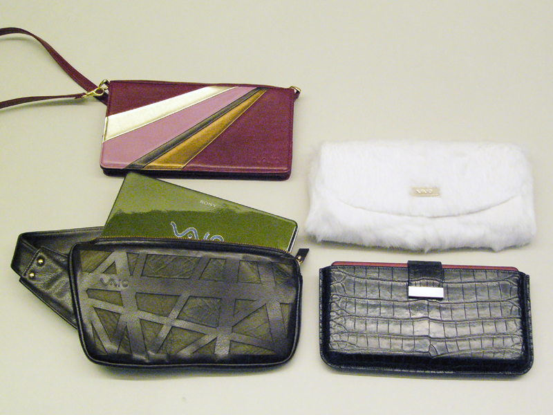 type Pの利用環境を想定し、ソニー社内では男性向け、女性向けの専用バッグも試作された。これらはすべて見本ではあるが、PCを持ち歩くという「経験」がイメージできる(クリックで拡大)