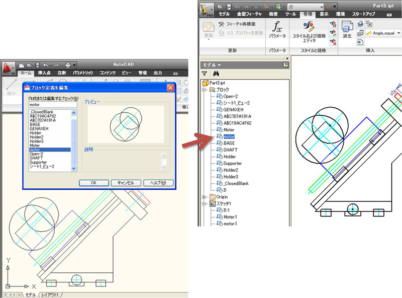 2Dと3Dの連携「スケッチブロック」機能。Inventorの2Dスケッチ環境に「ブロック」が追加され、スケッチ要素(線や円、寸法など)をグループ化したものを配置することができるようになる。ブロックはInventorで作成するだけでなく、AutoCAD から取り込むことも可能。AutoCADでは部品を表すのにブロックを使用し、複数のブロックでアセンブリを表現するのが一般的で、これをInventorのスケッチに配置することで簡易的な2D機構シミュレーションが可能になり、構想設計の効率が向上する。また、ブロックからInventorアセンブリ構造を自動生成し、必要な箇所だけ3Dモデリングを行い、重心計算、構造解析などさまざまな設計検討もできる。