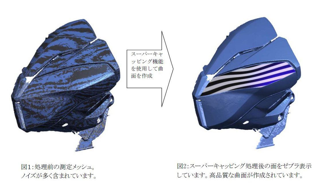 ThinkDesign 2009.1では、リバースエンジニアリング(RE)機能をはじめ、さまざまな業種のユーザーが活用できる新機能を追加、さらに既存機能の曲線の曲面上オフセット、投影線、勾配面の機能などが強化されている。リバースエンジニアリング向けの機能としては、ノイズの混じったメッシュから高品質な曲面を生成するスーパーキャッピング(上写真)、複数のフィレットを一気に変形することができるフィレット逃しコマンドを導入。さらに曲率の符号表示、モデルの品質チェック、設計変更チェックなど、形状の解析・確認機能が強化されている。