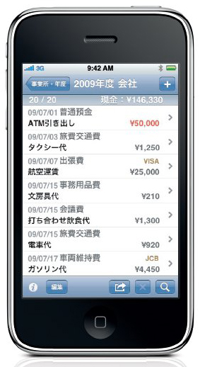 「A&A出先で会計」は、iPhoneまたはiPod touchを使って、外出先などで手軽に入出金の管理ができるiPhoneアプリ。本ソフトで入力した入出金データをメールで転送、またはオフィスに戻った際に専用のデータ転送ソフト「出先で会計データ受信」を利用することで、Macの定番会計ソフトである「A&A会計」へ自動的に伝票として読み込むことが可能となっている。