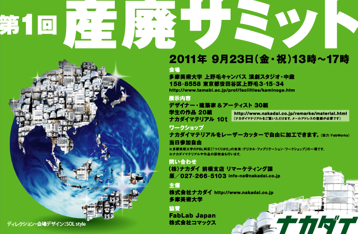 2010年のデザイナーズウィークでナカダイの考え方を展示し、その反響の大きさから、今回、デザイナー30組、多摩美術大学生20組を一堂に会した大規模なプロダクト展、「第1回産廃サミット」開催の運びとなった。会場では協賛企業コマックスによるレーザーカッターを使用したワークショップも体感できる。