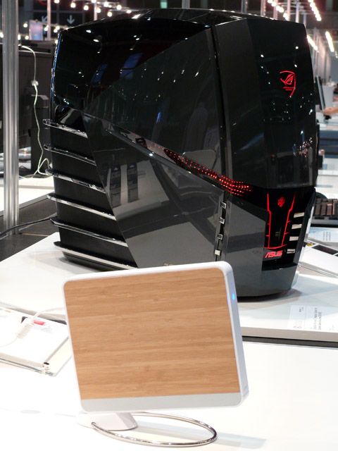 写真奥のモンスターなデスクトップPCはAsusTek Computer Inc.の「ASUS Ares CG 6155」。写真手前の超小型PC(名称未確認)と同じパソコンとは思えない。(クリックで拡大)