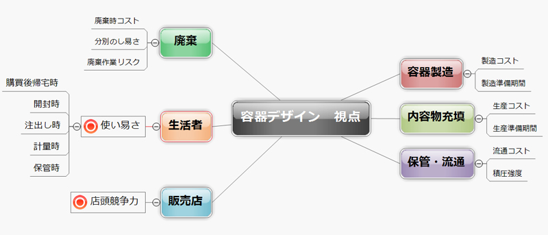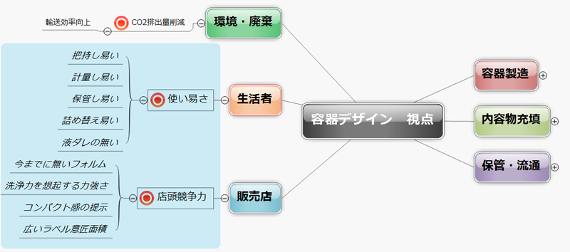 まず一般論としての容器デザインについて説明します。図1は容器デザインの視点をマインドマップで表現したものです。ここから分かることは、容器デザイナーは、さまざまな関連した課題の解決者・調整者としての役割を果たしているということです。
