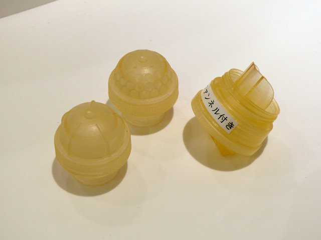 ラウンドフォルムの計量キャップ(左)と2重筒で詰め替え時間を短縮したノズルキャップ(右)のRP出力(クリックで拡大)