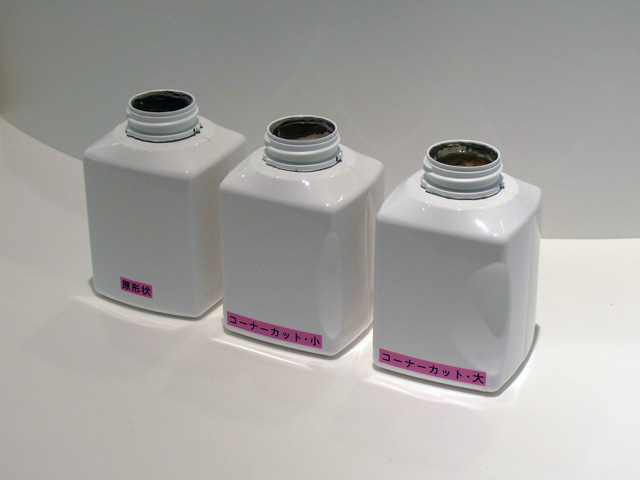 これらを基に制作した容器デザインが「キューブフォルムボトル」です。同容積でなるべく小さく見える形状として、立方体をモチーフに選定し、デザインに着手しましたが、容積面での制約からどうしても容器の奥行き寸法が大きくなりすぎてしまい、女性の手では持ちにくいものになってしまいました。