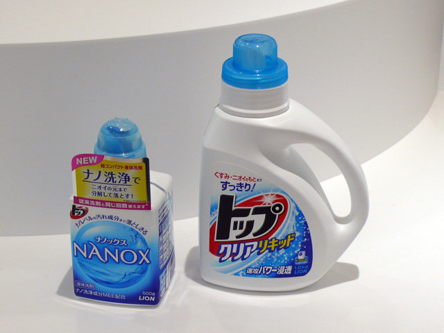 トップNANOXは、2010年1月20日にライオンが満を持して発売した、次世代の超コンパクト液体洗剤です。この洗剤はライオンが独自に開発した植物油脂を原料とする非イオン系界面活性剤「MEE」を高濃度に配合することにより、従来のライオン液体洗剤の1/2の量で洗濯ができるものです。