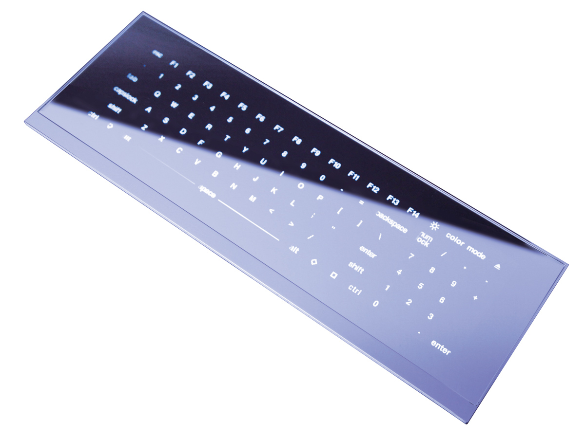 文字入力を行うには静電タッチセンサーに荷重センサーが必要です。それはミネベアの技術で実現しましたが、さらに鏡面のフラットなキーボードの表面に文字を浮かび上がらせるには、東レが開発したナノテクノロジーによる新素材フィルムが最適でした。