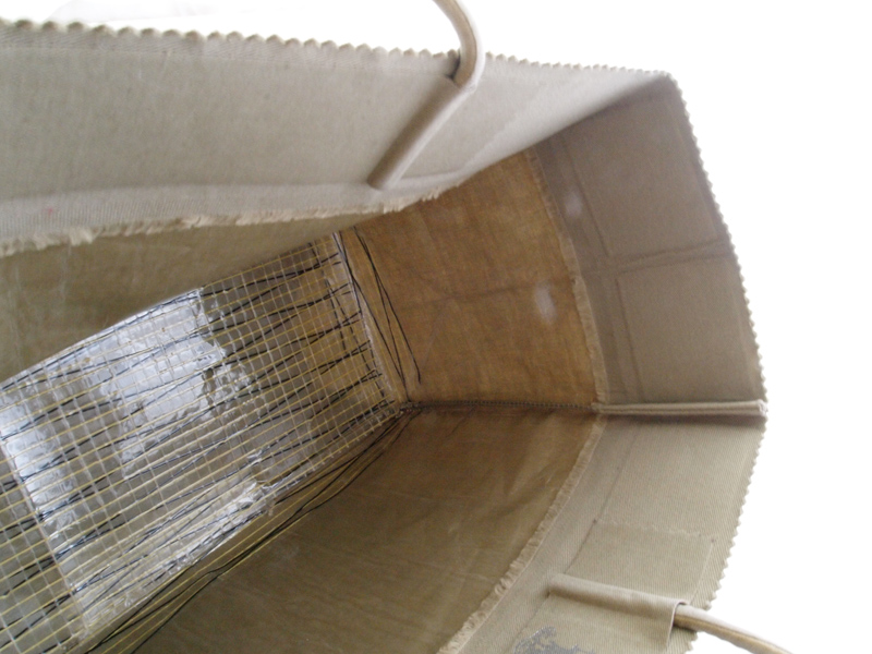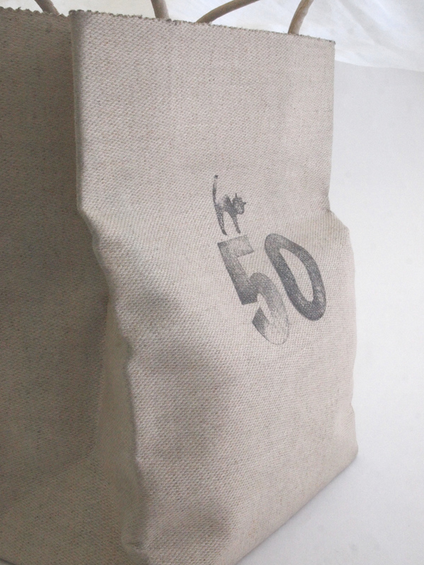 ●絶妙な風合いが美しい 多分、この紙袋のデザインは、とても良くできているのだと思うのだけど、そこで、ちょっと実験をしてみた。単に同じくらいの大きさの紙袋と、BBBagを、同じ人に持ってもらって、その見た目を比べてみたのだ(写真03、写真04)。まあ、わざわざやってみるまでもなく、BBBagの方が、遥かにカッコいい。それは柄とか、色とかではなく、角の張り具合だったり、把っ手の長さだったり、そして何より素材感だったりが、圧倒的に違うのだ。いや、カバンに関して、素材がいかに大事かなんてことは、分かってはいたのだけど、だから紙袋がダメなのではなく、紙袋のデザインは素材さえ選べば、相当カッコよい、という事を再認識できた。というか、まあ、カバンと言うのは四角いモノだなあというだけかも知れないけれど。それでも、端がピンと張った四角は、中々の美しさなのだ。 この張りと、柔らかさのバランスが、紙袋型のルックスを決めるような気がする。あまりエッジがピンと立ち過ぎていると、単に細部の仕上げを怠ったカバンか、新品の紙袋に見えるし、柔らか過ぎても、ただのエコバッグか草臥れた紙袋になる。厚手のワックスド・コットンを使ったBBBagの、しっとりとした質感と、きちんと張っているけれど、エッジが立たない絶妙な風合いが、BBBagと紙袋を隔てる大きな違いに見える。紙袋で言えば、ほんの少しだけ使った状態。形がシンプルだからこそ、ホンの少しの違いが、見た目に大きく影響する。縫い目を隠す仕上げで、より紙袋っぽくなっているのだけれど、それも、少しの違いに敏感だからこその選択なのだろう。