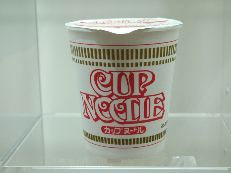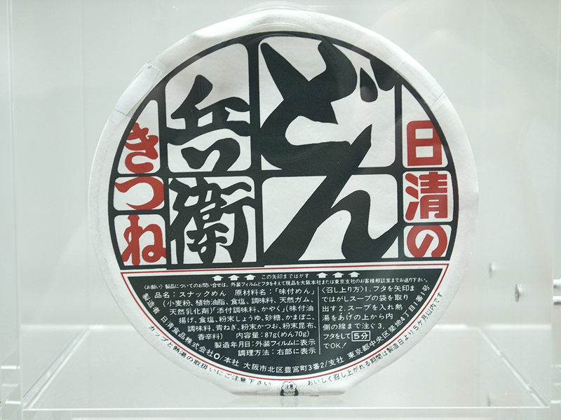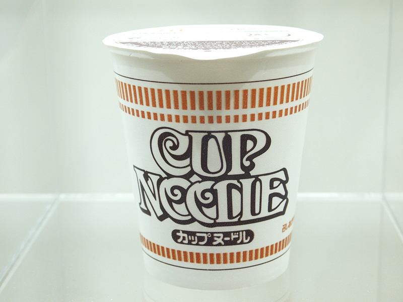 日清食品の「カップヌードル」、生誕40周年だそうだ。カップヌードルの発売は、当時8才の筆者もよく覚えているのだけど、その発売当時、「カップヌードル」という製品は、とてもお洒落な食べ物として売られていたと思う。価格も、その時点ですでにいくつものメーカーが参入していた袋入りの、いわゆる「インスタントラーメン」に比べて随分高かったし、量も少なかった。 「インスタントラーメン」を作ることでさえ、あまりに簡単だと考えられていた社会では、「カップヌードル」の「簡単」は、それほど評価されず、むしろ、カップに入ったラーメンをフォークで食べる、という新しいスタイルが注目されていたわけだ。 つまり、「カップヌードル」という製品そのものが、「インスタントラーメン」を新しくデザインした製品で、そのスタイルこそが新しかった。フォーク付きで売られていたなんてことは、今回、横浜、みなとみらいにオープンしたカップヌードルミュージアム(写真1)で、カップヌードルの考案者である安藤百福の伝記的な映像を見て思い出したくらいで、すっかり忘れていたのだけど、確かに「フォークで食べる」というのも新しかったのだ(食べにくいとは思ってたけど、それでもしばらくは、箸ではなく付属するフォークを使っていたと思う)。 ●変わらぬデザインと独自性 そして、40年、あの形、味、パッケージデザインは、ほとんど変わらないまま、元祖の「カップヌードル」は、いまだにカップ麺業界の売り上げトップを走っているそうだ。そして、日清食品自身にとっても越えられない壁になっているという。何しろ、味はもちろん、パッケージデザインを変えても、多数のユーザーから文句が出るというのだから、そのプロダクトデザインの浸透度は凄まじいものがある。 カップヌードルミュージアムの「インスタントラーメン・ヒストリーキューブ」には、歴代のさまざまなインスタントラーメンとカップ麺が時代順に展示されているのだけれど、最初に発売されたモノと、現行製品の間に、見た目の違いはほとんどないのだ(写真2、3)。印刷技術の向上で全体に鮮やかになったとか、現在金色で印刷されているキャタピラ柄が、かつては黄土色だったとか、ロゴ下のカップヌードルの文字が少し太くなったとか、そういった本当に細かいリファインはされているのだけど、例えば、基本ロゴの形と全体のムードだけを残して、まったく違うデザインに変化している「どん兵衛」シリーズ(写真4、5)と比べると、その変わらなさがよく分かる。普通、「どん兵衛」シリーズ程度の変化を「変わらない」と評するべきで、カップヌードルの変わらなさの方が異常だ。特に、食品のような時代性を最も反映するジャンルで、「ファッション」的な要素を前面に出して売り出した製品なのに、である。 また、味についても、現在の視点で良く考えたら、「カップヌードル」はラーメンとしては少しおかしい。普通ラーメンにエビは入ってないし、タマゴもあんな失敗した煎り卵みたいなものではないだろう。肉も、2009年からはチャーシュー的なもの(コロチャーである)になったとはいえ、その変化にさえ大クレームがついたし、それ以前のミンチ的な肉(正式名称はダイスミンチ)は、ピザの具材であるイタリアンソーセージに似てはいるものの、普通見かけないタイプのモノだった。そして、僕らも、発売当初、あまりラーメンとは思っていなかった。「カップヌードル」という食べ物だったのだ。