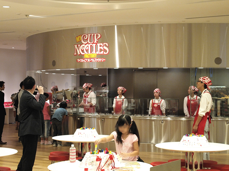 デザインと言う意味では、できあがったカップ麺を持ち帰る際に、壊れないように、空気を上手く利用した持ち帰りバックを用意していたり(写真12)、実際に、麺にカップを被せて回転させる仕組みを体験させたりといった、ハード面での仕掛けの方が、よりデザイン的なのかも知れない。しかし、それらはできあがったものでしかないし、自分で考えた、想像した新しいカップヌードルそのもののデザインには敵わない。作った時から、食べたくてしょうがなかったし、食べた後のカップは、写真撮った後、何の未練もなく捨てられたけれど、もう一度行って、今度はシーフード味に挑戦だ、と胸の奥に何だか分からない火が点いてしまったのだから。 そうやって、自分で作ってみて再認識するのは、「カップヌードル」という商品の新しさ。似てるものがないのだ。40年、方法としてのカップ麺には膨大な数の類似品が登場したけれど、デザインとしての「カップヌードル」は、いまだに孤高のナンバーワンだ。カップヌードルミュージアムには、要予約の人気アトラクション「チキンラーメンファクトリー」があって、こちらは、チキンラーメンを粉から作る体験ができる、それはそれは楽しいものなのだが、こちらは「追体験」のアトラクション。そして、分かるのは「チキンラーメン」が、きちんと作られているラーメンなんだな、ということ(写真13)。「チキンラーメン」も、ほとんど内容を弄れないまま、ずっと売れ続けている商品で、だから「タマゴポケット」は凄い大発明だったのだという。要するに、味やルックスを変えることなく、確実なバージョンアップはユーザーに示せるアイデアだったということだ。そういう意味では、カップヌードルでも、シュリンクパッケージの底にシールを貼って、パッケージを開けやすくした上に、お湯を入れた後のフタを留めるシールとして使える、というアイデアは凄かったと思う。フタの糊も、剥がしやすくなってるような気がする。 では、「カップヌードル」が最初から完成度が高かったのかというと、そうではないと思う。食品としての完結性は高かったと思うけれど、具材や味、パッケージデザインなどは、それがベストだったかと言うと、他の可能性もあったとは思うのだ。ただ、その全体が、全部新しくて、新しいまま多くの人に受け入れられてしまった。そして、先行商品としてのインスタントラーメンがすでにあったせいで、その新しさの質(例えば「ラーメン」ですらなかったということなど)については、意外に気がつかれないまま、当たり前のように多くの人に愛されてしまったのだと思う。その意味でも、「カップヌードル」は、製品である前に発明品なのだろう。