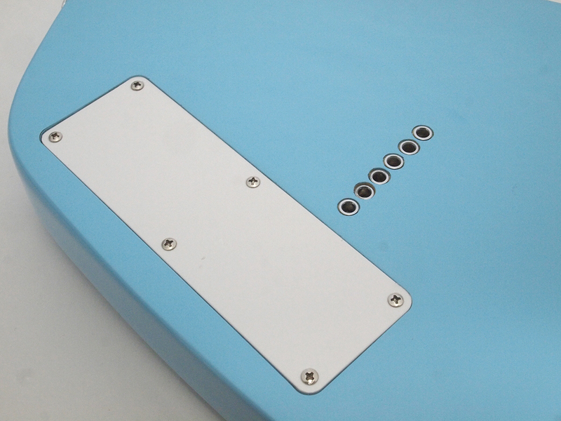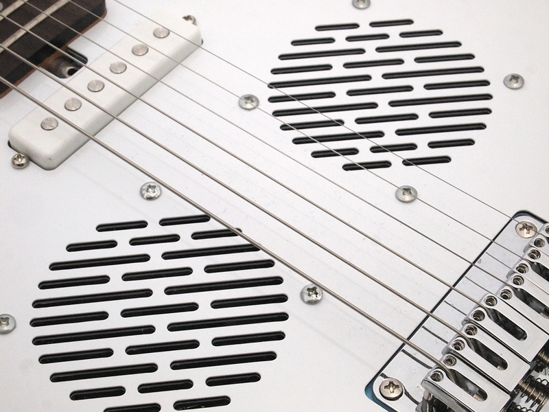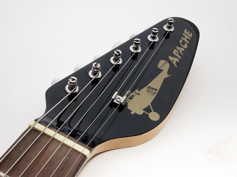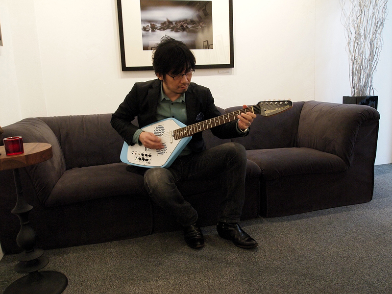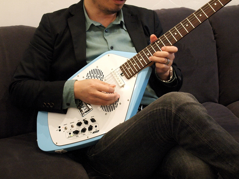 ●洗練されすぎない可愛らしさ 筆者が借りていたのは、「APACHE II」という、ファントム・モデルの方で、形としてはよりビザールな方だ。実物は、写真で見るより、もう少しスマートで、意外にカッコいい。しかし、ただでさえ特徴的なデザインなのに、スピーカーのために穴が開いているせいで、友人に「弱くなったウルトラマンみたいだ」と言われてしまった。しかし一方で、ピックアップは1個しかついていないのに、やたらと、つまみやスイッチが並ぶ様は何とも魅力的。リズムボックスを鳴らしながらの演奏は、思った以上に楽しくて弾き始めたらやめられない。往年の名曲のドラムパターンが入っているのも面白い。ゲインとボリュームが分かれているので、本体だけでナチュラルディストーション風の音が楽しめるのも嬉しい。できれば、エフェクターの出力を本体にループして、内蔵スピーカーからエフェクターを通した音が出せたりすると、さらによかったのだが、その機能はなかった(ZO-3の一部機種には搭載)。 弾いてみると、まあ決してすごく弾きやすいということはないが、思った以上に弾きやすかった。ストラップなしでも、ソファなどで足を組んで、ボディをソファの上に流すようにして持つ(写真7)と中々快適。ミディアムスケールだし、日本人の手に合うギターだと思う。デザイン的には、本体のほとんどがピックガードなので、思いきって、そこにペインティングするとよさそうだ。ヘッドが大き過ぎる(写真8)のと、ペグがしっかりしていないので、2曲も弾くとチューニングがかなり狂うのは多少問題だが、簡易チューナーを搭載してるので、チューニング自体は面倒くさくない。ネックの取り付け部分など、工作精度の低さが気になる部分もあるけれど、この性能とデザインで、29,000円というのは、とてもコストパフォーマンスが高いと思う。練習用としては最高ではないだろうか。 そして、ここまで変わったデザインのギターだと、いかにも練習用っぽくて、その感じも悪くないと思った。何と言うか、ガシガシとラフに使うのが似合うと思うのだ。プロのデザイナーが関わっていないのが納得できるようなフォルムは、しかし、デザイナーが入るだけで、洗練され過ぎてしまうような気がする。おかしなギターだなあと思いながら弾いていると、それでもどこか可愛くなってくるのだ。一方で、ギブソンのレスポールのような、あまりにデザインの完成度が高くて、木工の工芸品のようなギターもある。素人目には自由度が大きそうなエレキギターだけれど、そのバランスは長年の経験や勘を必要とするのだろう。 |