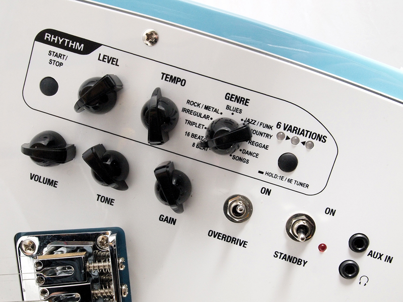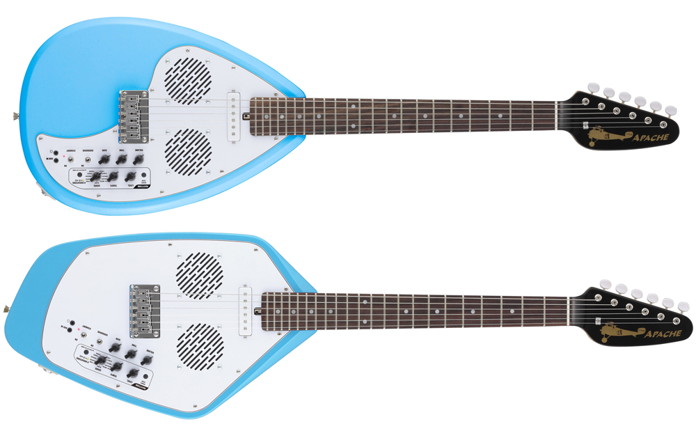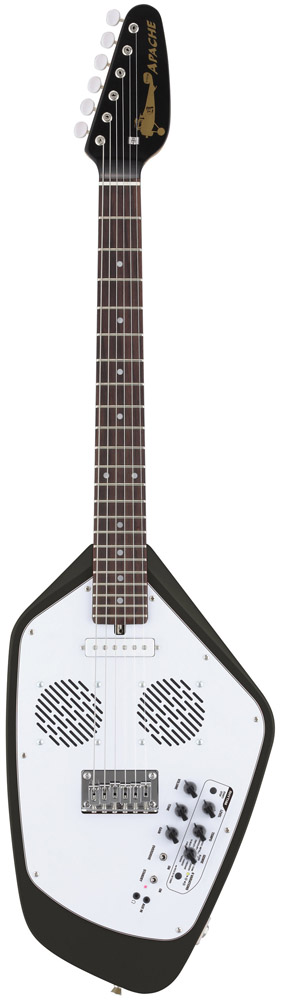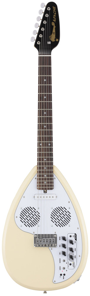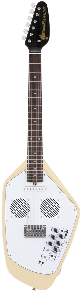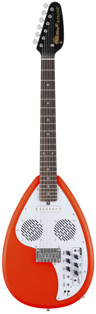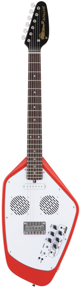 ●オールインワンのトラベルギター フェルナンデスの「ZO-3」という、横にして見ると象に見える(ネックが鼻になる)アンプ内蔵型のミニギターがあって、さまざまなデザインモデルが発売されているが、これも、デザインはペイント部分のみで、基本の形はフェルナンデス内部で作られている。別に、この形状でなければ、というのは、ほとんどないのがエレキギターの特徴なのだから(アルフィーの高見沢俊彦氏使用の羽が生えたギターも、スタインバーガーのような削ぎ落としたデザインも、同じエレキギターなのだから、形の自由度は相当高い)、プロダクトデザイナーと組む企画があってもよいはずだけれど、あまり聞かない。むしろ、クイーンのブライアン・メイのように、自作したからデザインも自分というケースや、ギタリストが発注する形で新しいデザインが生まれるというケースなど、ミュージシャンサイドでデザインを発案するケースが多く見られる。 VOXの新製品「Apache」は、見るからにデザインがおかしい、いわゆるビザールギターと呼ばれるカテゴリーのものだが、これらのギターにも、特別なデザイナーはいない。かつて、VOXが出していた2つのギター、1つは「ティアドロップ」と呼ばれる、涙の粒のような形のギター(写真1)。このオリジナルは、ローリング・ストーンズの故ブライアン・ジョーンズ氏が愛用していたことで有名。また、もう1つは、「ファントム」という名のギター(写真2)で、最近では同じ形のものを東京事変の浮雲氏が使っている。この2つのギターのデザインを踏襲した、復刻というかリメイクなのだ。しかも、同じなのは、その外観というか輪郭のみ。元々変わった形なのに、さらにVOXは、アンプを内蔵(写真3)。さらにリズムボックスとチューナー、オーバードライブを搭載。ヘッドフォン端子に外部入力端子まで付けた、それ1台でどこででも演奏できるマシンみたいにしてしまったのだ。そのコンセプトはトラベルギター。 確かに、これだけ持っていれば、どこででもギターが弾ける。リズムも多彩(66種類)だし(写真4)、チューニングもできるし、スピーカーは3インチのものが2個搭載されていて、中々大きな音が出る。オリジナルと違って、ピックアップはフロントにシングルタイプが1個のみで、確かにパワー不足な感じはあるのだけど、オーバードライブの効きがよいので気持ちよく弾ける。むしろ、内蔵のスピーカーから音を出す場合、これ以上高出力のピックアップだと、音の歪みが激しくなり過ぎそうだ。ヘッドフォン端子があるのは、弾く場所と時間を選ばないので便利だし、外部入力端子は、iPhoneなどに入れた曲と合わせて演奏が楽しめるl。どちらも、確かに旅のお伴に嬉しい機能だ。 ただ、筆者は、このギターを抱えて1日中歩き回ったのだけど、持ち歩くにはちょっと重くて大きい。ミディアムスケールのネックは短めなのだけど、その分ヘッドが大きく、ブリッジの下の空白が広いため、本体サイズは通常のエレキギターと変わらないのだ(写真5)。さらに電源として単三乾電池が6本入っているのでさらに重い。もっとも、あの四角い006Pの9V電池が使われることが多い楽器業界で、どこででも気軽に手に入り、エネループなども使える単三乾電池の採用は嬉しいのだけど、重いのは重いのだ。また、電池を入れるためには(写真6)、6ヶ所のネジを外さなければならないのも、カジュアルに使うギターとしてはどうかと思う。電池を入れる部分だけでも、そんな風に矛盾しているし、旅に向いた機能だけど大きくて重いとか、良いと悪いが表裏一体なのが、この「Apache」全体の特徴と言ってもいいかもしれない。