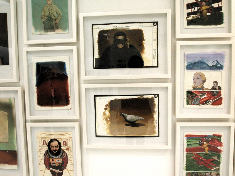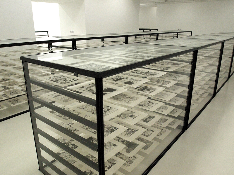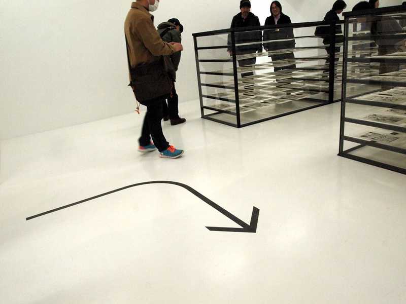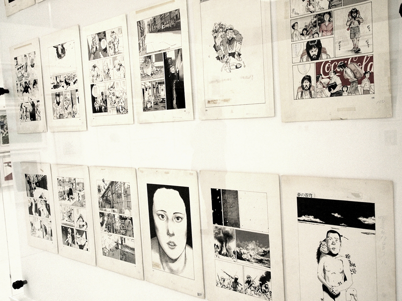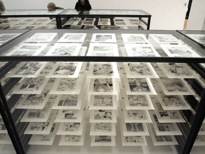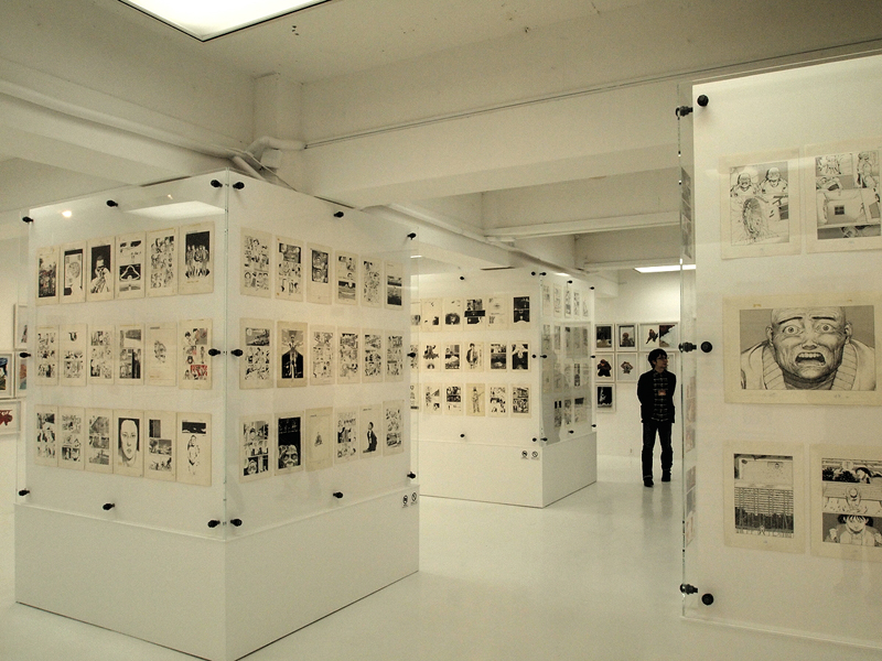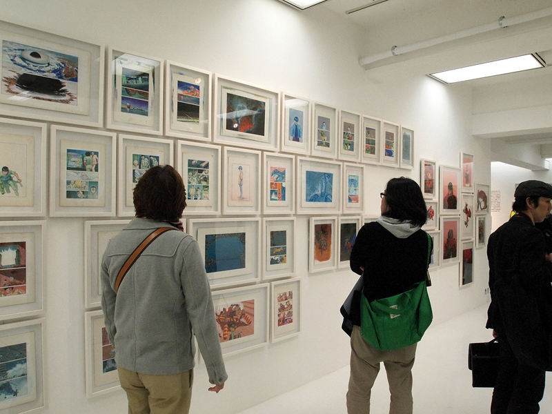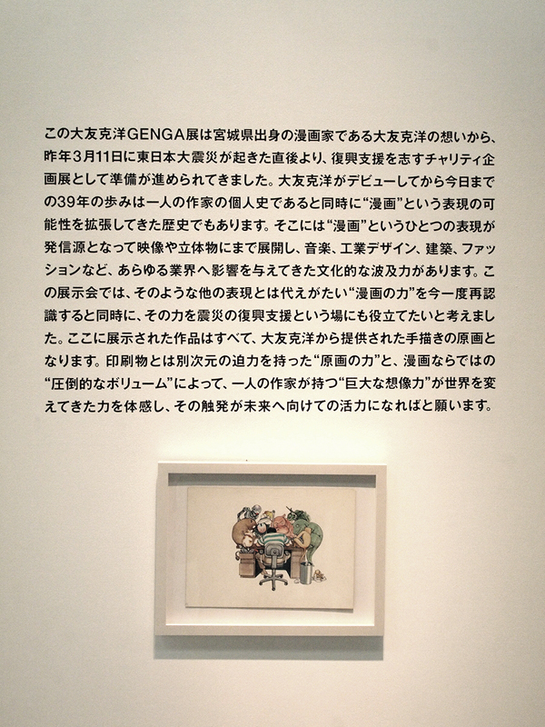 ●見せ方にもこだわった展示スタイル 「AKIRA」全ページを見せるための展示方法は、ガラスケースとピアノ線を使った、言ってみれば紙物の乾燥台的な方法。各ページを5枚づつ、2列7段に並べることで、70枚の原画を1つのケースで見せている(写真7)。棚によっては3列の場合もあり、そのケースがずらりと並ぶ姿は圧巻。すべてを読もうと思うと、一方向からだと、どうしてもページが重なって見えない箇所があり。かといって、ケースを周りながらページを追うのは不可能ではないだろうが、他のお客さんもいることだし、ケース同士はくっついた状態で並んでいる(写真8)ので、ほぼ無理だ。ただ、絵の流れは十分把握することができるので、連載当初からの絵の変遷や、エピソードごとの演出の変化、さらには、大量の絵が作る作品そのものを体感できる。マンガという表現は、印刷・製本されることで完成するモノだから、ここにある「AKIRA」はあくまでも「AKIRA」の材料であり、完成品が欲しければ、普通に会場や本屋で購入する。それもまた、マンガの原画展の凄いところだ。 「AKIRA」を作るほぼすべてのパーツを見るに当たって、事前に「AKIRA」を読んでおくと、その明らかに解像度が違う、原画ならではの迫力を、より感じやすいかも知れない。このシーンがどんな風に続いていくのか、その物語を把握した状態で見る方が、この「全ページ展示」というスタイルには向いているような気がするのだ。絵を、物語の流れの上で見ていける、というのは、マンガの体験に近いし、それを、実際に描かれた線で見ることで、作品の生々しさを体験できる。こんなふうに見ることができるおかげで「絵だけでも凄い」と思わなくて済むのは、とても嬉しいことだと思った。 この展示スタイルは、もし大手のスポンサーが付いていたら実現しなかったかも知れない。何より、これだけの絵の展覧会なのに、きちんと会場が明るい(写真9)というのが嬉しいのだけど、雰囲気を大事にするスポンサーなら、この普通に蛍光灯で照らされた会場にはならなかったと思うのだ。しかし、「AKIRA」全ページ展示には、この明るさが不可欠だし、他の作品にしても、普通にマンガを読める明るさで、マンガを読む距離で見ることができるというのは、とても重要なこと。それを実現できているだけでも、この展覧会のデザインは新しいし、作品主体であると言えるのだ。こんな風に見よう、といった誘導がなくて(写真10)、ただ重要な、「AKIRA」のページを順序良く見るためのガイド(写真11)はしっかりと表示されているという、その正しさが、「マンガ」であることを、きちんと主張しているように感じられた。 あと、細かいことだけれど、壁面の角に当たる部分は、その片方にだけ作品を展示して(写真12)、そこで人がターンして見る時に渋滞が起こらないようになっていたのも好感が持てた。多くのお客さんに見て欲しくて、多くのお客さんが来るのならば、角部分に余裕を持たせるのはとても重要なはずなのだけど、これができているギャラリーはとても少ない。また、「AKIRA」に関しては順路が大事だけれど、それ以外の展示については、この順番で見ろ、というような導線が全くない。その適当に見られる感じも、大友克洋の作品を裏切らない。