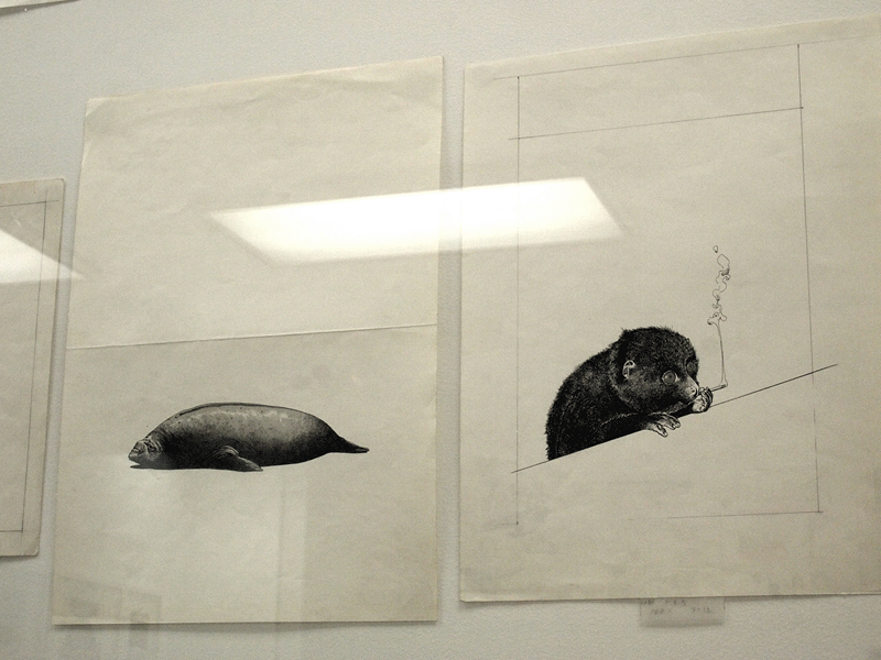 ●大判が魅力の図録 図録(写真13)に関しても、とても考えられていると思った。実際のところ、マンガの原画展に図録というのは、意味がないとも言えるモノだ。何といっても、普通に「作品」その物が買えてしまうし、それは原画以上に完成品であり、図録と同じ「原画を印刷したモノ」なのだ。今回の図録が、やたら判型がデカイのは「マンガ」との差別化。そして、最も大事な書誌的なデータというか、展覧会に飾られた作品の初出誌、その年月日などはしっかりと収録されている。やや編集が荒い感じもするけれど、そのラフさも含めて、実際の展覧会のムードを記録した本にはなっている。実際のところを言えば、この図録に5,040円出すなら、それで持っていない大友克洋の単行本を買う方が、よほど、大友克洋を楽しめるのだけど、記念に持っていたくなるのは、やはり、その判型の大きさの勝利だと思う。 と言いながら、それでも初期のイラストや同人誌「綺譚」の表紙(写真14)、「饅頭こわい」のようなイラストエッセイ的な作品などを見ると、それらが単行本未収録作品だったりもするので、懐かしさや、その絵に感動した高校生の頃の記憶や、同時代の新しい作家を見出したような気分なんかが押し寄せてきて、冷静に見ることなんか全然できなかったりするのだけれど、そういうのも含めて、大友克洋GENGA展の面白さなのだと思うのだ。むしろ、大友克洋という作家の本領は、そういう「時代の空気ごと」マンガにするところにあるのだと思っている。その意味では、それがマンガでも、アニメーションでも、原画展でも、同じように「大友克洋」に触れることができるはずだ。今回の原画展も、そんな風に組み立てられていたと思う。