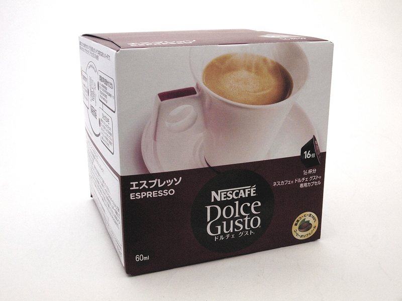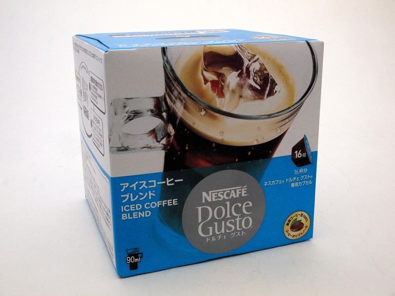 ●アイスコーヒーも簡単 カプセル型の利点の応用として、このマシンは、冷たい飲み物も簡単に淹れられる。普通、コーヒーメーカーでアイスコーヒーを作る場合、濃いめに設定したコーヒーを、氷をたっぷり入れたカップに注ぐことで作るが、カプセルの場合、セットしたカップに氷を入れて、抽出レバーを倒せば、冷たい飲み物になる。カプセルも、「アイスコーヒーブレンド」が用意されている(写真15)。 さらに応用として(ネスレでは以下の方法は推奨していないのだが)、エスプレッソにミルクを合わせたり、チョコチーノにエスプレッソを混ぜたりと、オリジナルな組み合わせを楽しむこともできる(写真16)。操作が簡単で、構造もシンプルで、でも、ユーザーの好みやアイデアを反映できる。この「ドルチェ グスト メロディ」を使い始めてから、日々、使う頻度が増えているのは、そういう身近に置いておく道具として、毎日使うツールとしての設計の優秀さに拠るものだと思う。