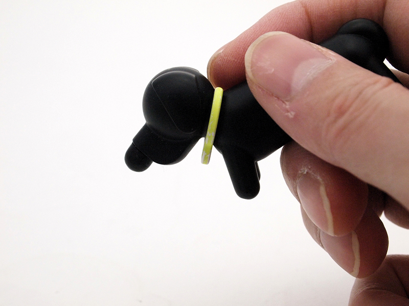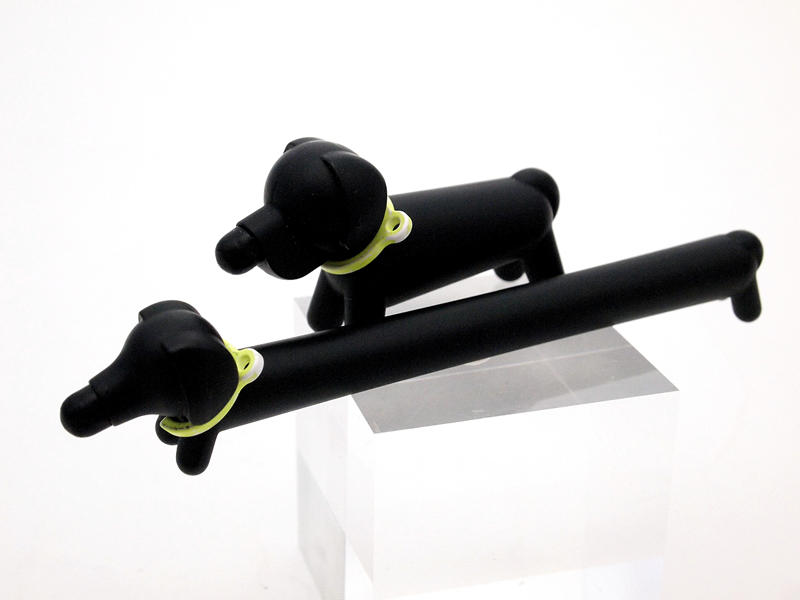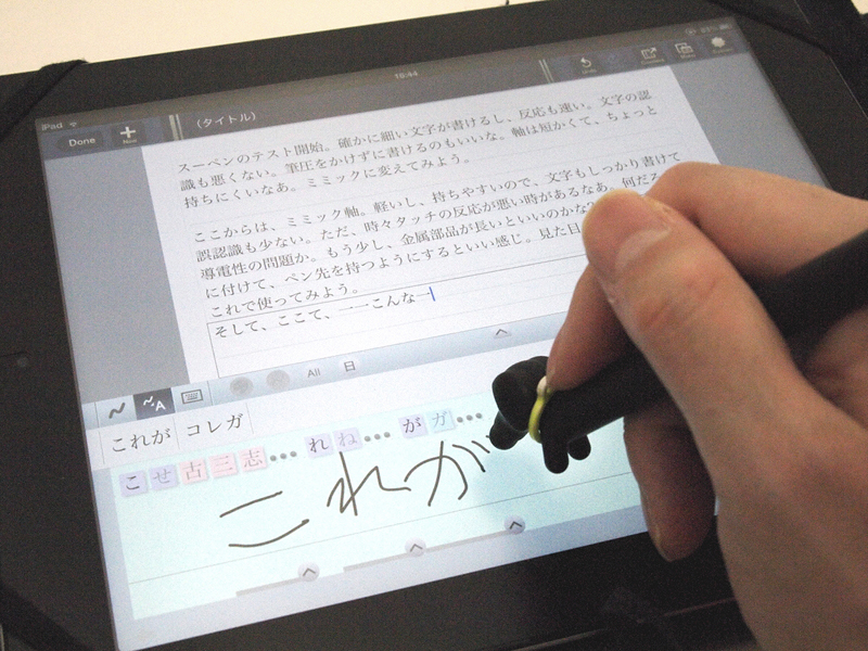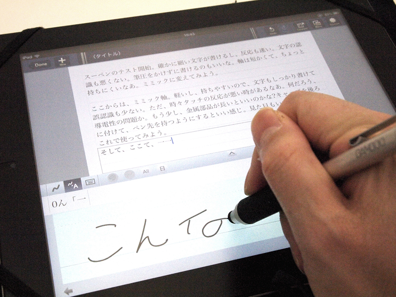 ●感圧式パネルから静電式パネル対応へ かつて、PDAと呼ばれる携帯端末があって、PalmとかVisorとかClieとかPocketPCとか、ザウルスとか、ニュートンとか、さまざまな製品があった。まだインターネットが普及する前だったから、基本的にはネットにはつながらず、モデム経由でパソコン通信ができる程度。主な用途は個人情報を中心としたプライベートなデータの管理とテキスト作成。インターフェイスはiPadなどと同じく液晶のタッチパネルだったのだけど、今と大きく違うのは、そのパネルが感圧式で、スタイラスペンでの入力が一般的だったこと。 iPhoneやiPadを始め、現在のタッチパネルは静電式がメインで、基本的には指で操作することになっている。従来のスタイラスペンは使えない。PDAではスタイラスペンでの操作が前提だったせいか、デザイン的にも機能的にもかなりの進歩を遂げていた。4Cのリフィルにペン先の視界を確保するため丁寧に角度を調整したペン先を装着したタイプなど、ラミー2000のような、持ちやすいマルチペンに装着可能で、微細な操作を普段使っている筆記具で実現する、というところまで来ていた。 静電式のパネルの場合、ペン先が通電していて、なおかつ、ある程度の接地面積が必要。そのため、感圧式のスタイラスペンのような、シャープなフォルムや固い素材のものは作ることができない。指先で操作することが前提なので、タッチパネルのセンサーの解像度もそう高く設定できない。その結果、ピンポイントで線を引きたい部分に正確にペン先を置くとか、筆圧を細かくコントロールすることが難しい。ペンと指とで、それほど性能差が出ないのだ。 そういう仕様だから、ペンの用途が、手が汚れていても操作できるとか、子供のお絵描きアプリ用とかになってしまう。よくて、手書き文字認識タイプのエディタ入力用程度だ。用途が限定されると、製品自体の進歩も遅くなる。また、仕様の限界があるため、ペンタブレットのようなプロが絵を描けるレベルの製品は簡単には作れない。 そういう状況が続く中、このところ立て続けに、さまざま々な工夫を凝らした静電式タッチパネル対応のスタイラスペンが登場してきた。中でも、TENTの「Touch Dog」、ワコムの「Bamboo Stylus pocket」、メタモジの「Su-Pen CL」は、それぞれに、今後のスタイラスペンの方向を示しているようで面白いと思った。こういう製品が出てくるということは、今後、当たり前のように使えるスタイラスが登場すると思えるのだ。 ●犬のフィギュアのようなTENT「Touch Dog」 TENTの「Touch Dog」(写真01)は、金属ではない導電素材を、軸全体に使うことで、軸そのものをデザインできる、という可能性を見せたスタイラスペン。導電性のABS樹脂を使うことで、比較的安価に、デザイン性の高い軸を実現。犬のフィギュアのようなスタイルは、置いておくにも適していて、必要な時には、サッとつかむと、足が上手く滑り止めのように機能してくれるのだ。また、犬の鼻先に付けられたペン先は、握った軸の延長線上より、少しズレた位置にあって、大きめになりがちなスタイラスのペン先周囲の見通しがよくなっている(写真02)。これがiPadなどで文字を描く際に、自分が引いた線を見やすくしてくれる。 ペン先は、静電式のスタイラスペンの定番でもある導電性のシリコン素材だが、表面を滑りやすく加工し、直径も6ミリとスタイラスペンとしては細身。固さも十分なテストの上で調整されていて、画面上できちんと滑るペン先(写真03)になっている。これは、実際にいろいろ比べてみると分かるのだが、同じシリコンのペン先でも、固さや表面の加工次第で書き味は全然違ってくる。この「Touch Dog」は、そのあたりが良くできているのだ。 さらに、この犬の形状もよく考えられている。小さい「レトリバー」は、iPhoneでの入力も考えた小型サイズだが、全体が通電素材なので、どこを握っても書ける。後ろから握るようにすると、力加減がちょうど良く(写真04)、自然に筆圧をかけられるので、スタイラスペン特有の「ギュッ」とペン先に力を入れる感覚なしで筆記できるのだ。その感覚は、筆記時以上に通常操作にとても合っていて、指の延長として使える。長い「ダックスフント」の方も、軸の太さや素材の感触が、金属軸に比べて格段に自然で、フィット感が良い。スマートフォンなどの機器と一緒に持ち歩くことが前提のペンなので、首輪部分にストラップなどを装着できるのも助かる。