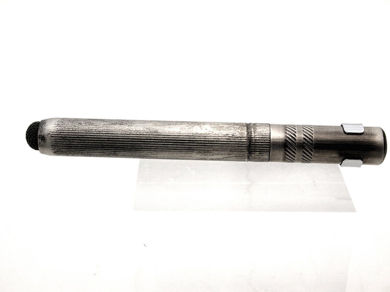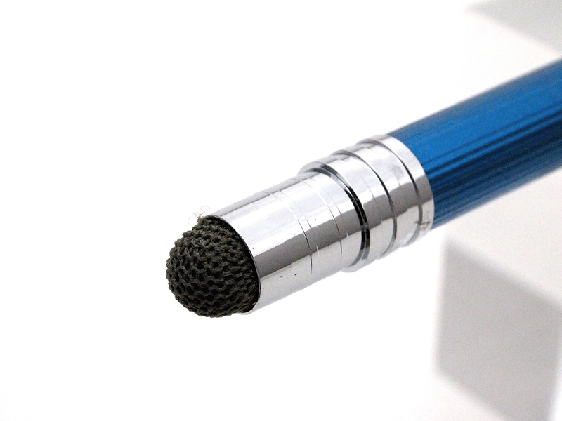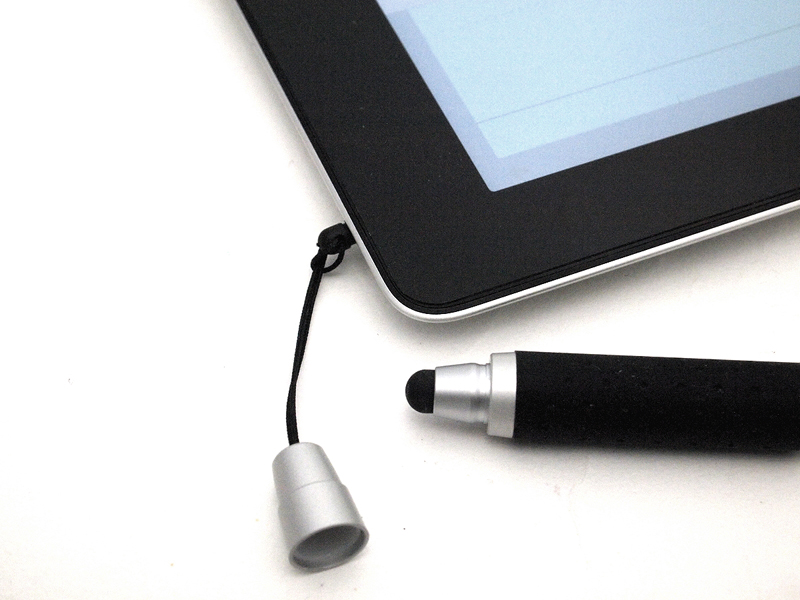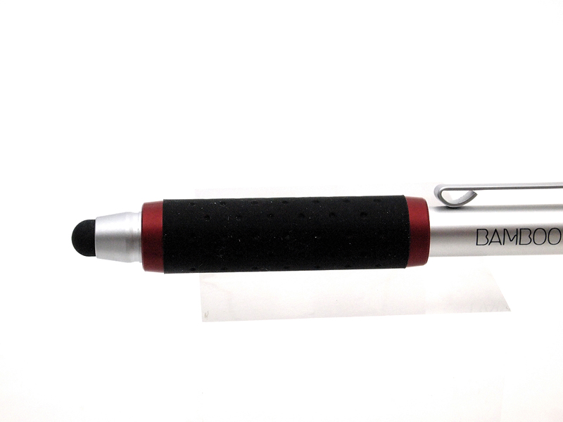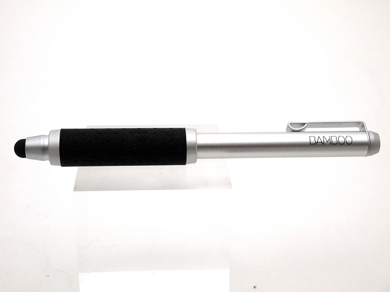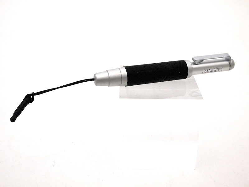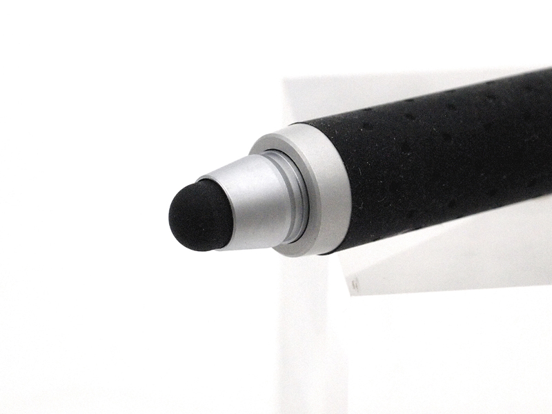 ●絵に適したワコム「Bamboo Stylus pocket」 同じく導電性シリコンのペン先を採用しているワコムの「Bamboo Stylus pocket」(写真05)は、筆記用具としてのスタイラスペンという、王道というか、ど真ん中をいく製品として、とても完成度が高いもの。元々、「Bamboo Stylus」シリーズ自体、従来の筆記具の延長上にある、持っていて嬉しく、持ちやすい、高級筆記具的な方向を狙ったもので、「Bamboo Stylus pocket」は、その携帯筆記具バージョンと言えるだろう。しかも、単に小型化しました、というのではなく、これもボールペンの世界にあるような、軸の伸縮で、携帯時は短くても筆記時は適性の長さになるというスタイル(写真06)。さらに、グリップ部分はラバー製(写真07)で滑りにくく、筆記時の力も拡散できて長時間の筆記が楽。この工夫も、ボールペンなどで使われる手法だ。 この、すでに長い時間をかけて書き易さを研究してきたボールペン、特に高級ボールペンに倣うという発想は、あるようでなかなかない。しかし、感圧式のスタイラスペンの頂点が、クロスやラミーの軸に仕込めるスタイラスペンだったことを考えると、この方向は、とても正しく、また王道とも言える。軸の伸縮スタイルも、安手のメカニズムではなく、高級筆記具に使われているスタイルに近く、伸縮操作そのものが、スムーズに気持ちよく動作するように作られている。キャップ部分がイヤフォンジャックに刺さるギミック(写真08)も、ともすれば安っぽくなる所を、キャップの着脱時の感触が心地よいので、ギミックというより、機能として感じられるのだ。こういう細部の丁寧な仕事ぶりが、このスタイラスペン最大の魅力。 ペン先は、やや固めの6ミリ径(写真09)で、しっかりと筆圧をかけて書くセッティング(もう少し柔らかいタイプのペン先も付属)。文字よりも絵を描くための仕様という感じがする。そのため、通常の操作よりも、しっかりと線を引く用途に向いているようで、あまり絵を描くことがない筆者には、その進化を引き出せなかったように感じる。ゴムグリップはとても感触がよく、スタイラスペンというよりも、通常の筆記具を使っている感触に近い(写真10)。その分、スタイラスペンを意識することなく線が引けるのは、このペンならではの魅力だろう。